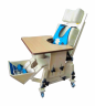 Опора для сидения с прямой спинкой анатомической формы до плеча помогает создать правильное, симметричное положение ребенка и удерживать равновесие в положении сидя, с помощью регулируемых по высоте ножек и подлокотников, тазобедренного крепления, в виде одиночного ремня, установленного под углом 45° и грудного регулируемого крепления «жилетик». Сидение имеет регулируемый съемный абдуктор. Опора снабжена столиком, который крепится на подлокотники. В комплект входит стол-парта, регулируемая по высоте и углу наклона столешницы.  Мягкие элементы на поролоне, обтянуты искусственной кожей. Изделие окрашено мебельным лаком.